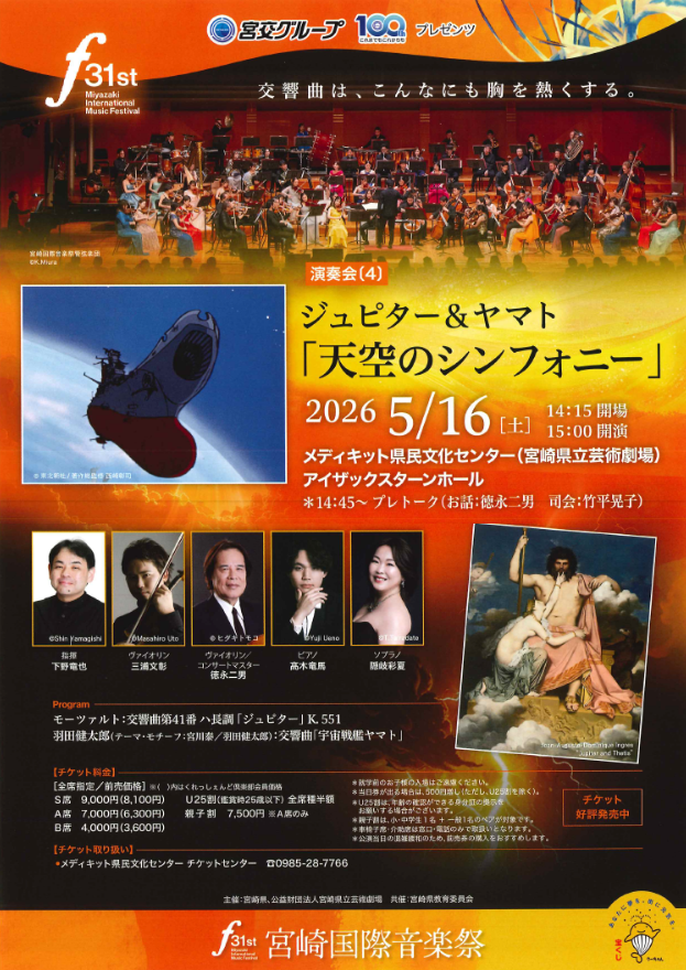 宮交グループ創立100周年を記念し、第31回宮崎国際音楽祭において、5月16日(土)に開催される演奏会『ジュピター&ヤマト「天空のシンフォニー」』に協賛することとなりました。